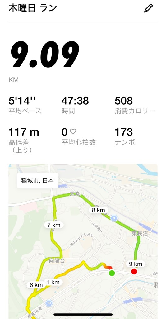 夜は丘を駆け上り、400メートルのインターバル走を5周。周回路を出てジョグを4キロほど。計9キロ、5分14秒ペース。