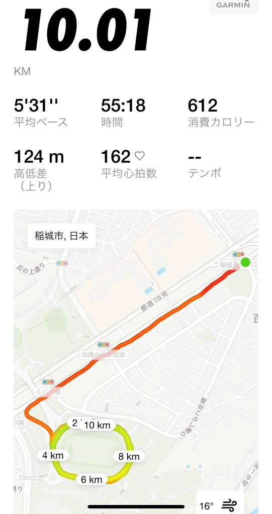 夜は丘の上の周回路へ。アップダウンの10キロを5分31秒ペース。最後の2キロは負荷をあげた。そろそろ平坦路でのトレーニングに切り替えてレース本番に備えなければ。