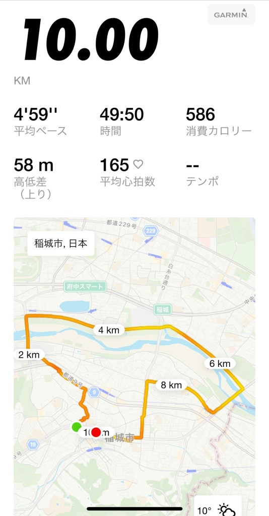 夕方から走った。10キロを気持ちよく飛ばした。キロ5分50秒から始めて、4キロから10キロまではキロ5分を切るタイムまで上げた。