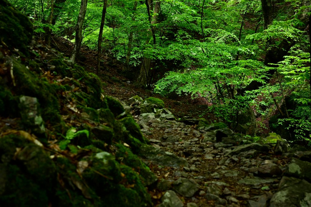 コースの前半は渡渉を5回ほど繰り返しながら、沢沿いを山の奥へと進んだ。水量が多いから気を使った。休業中の小滝小屋の先に壁が現れる。よじ登るようにして一気に高度をあげた。なかなかの急登だったが、時間をかけて登れば難しいところはない。こちらから見て向こう側の八丁尾根ルートは高難度のコースらしい。