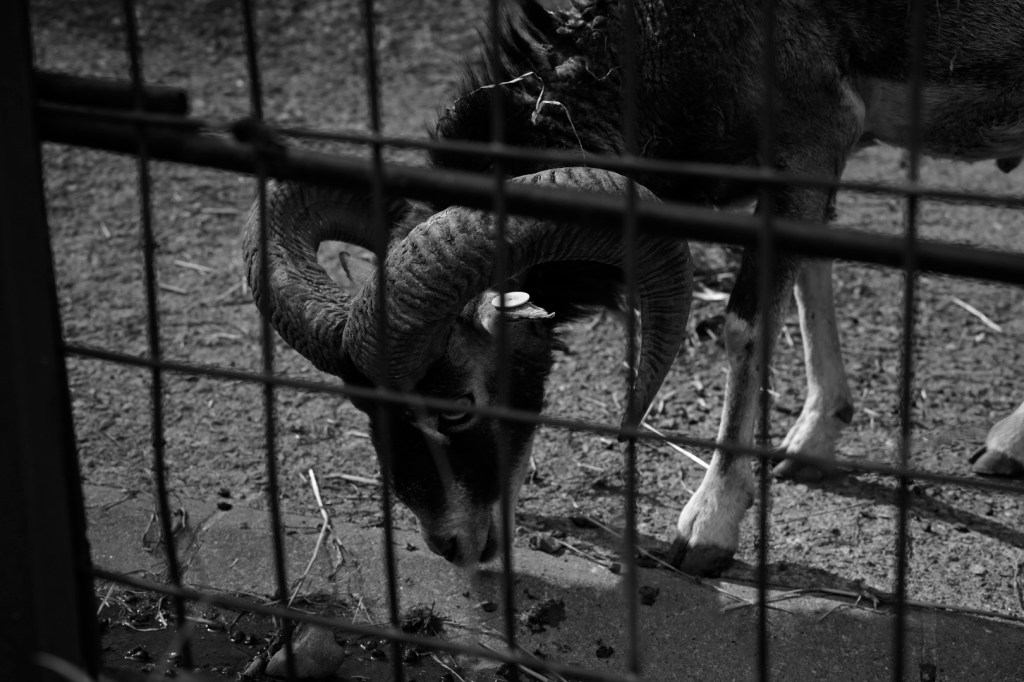 ムフロンの雄。野生の羊で、家畜の羊の原種の一つとも。渦巻き型のツノが美しい。
