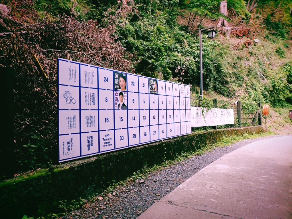 奥多摩の山域は雲取山の方へ行ってばかりで、こちらの関東平野に面した側へは初めて来た。御岳山の頂上一帯には武蔵御嶽神社の参道を囲むようにちょっとした町が広がっていて住民の暮らしがあった。民宿、土産物店、飲食店などの観光客向けの商店と並んで個人宅や診療所がある。都知事選の立候補者掲示板もあった。