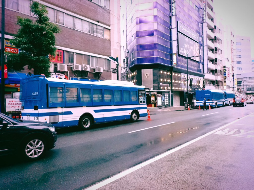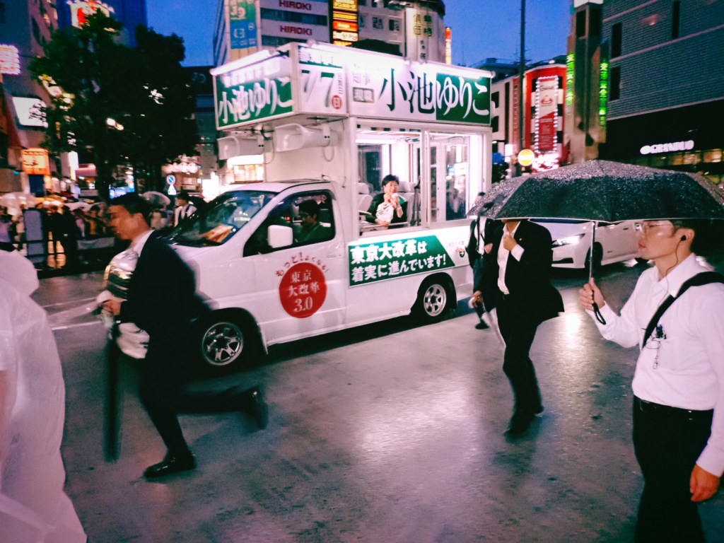 小池さんの演説が始まる1時間前の17時半ごろ蒲田駅西口に着くと、ロータリーを警察車両が囲み、ものものしい警戒態勢が取られている。広場には大量の鉄柵が張り巡らされ、聴衆はその中に入るように求められる。そしてその入り口では小池陣営のスタッフが手荷物検査を行い、警官が金属探知機を当てる。支持者は雨の中ぞろぞろとそのゲートを通過していく。そして鉄柵の外には、反小池を明確に表現する人たちや、そうでないにしても”敵情視察”に訪れた人たち(ぼくもこのうちの一人)、無関心層のやじ馬的な集まり、などがロータリーの外周を占めた。