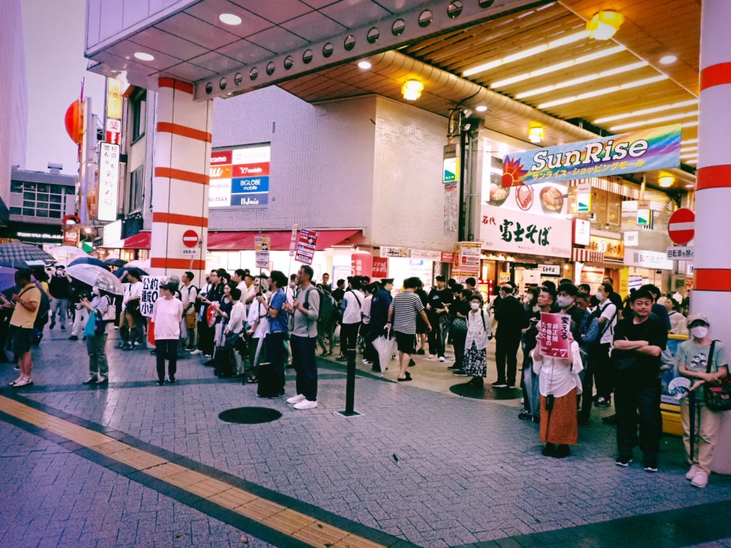 よってぼくはロータリーの外周から会場全体を観察していたのだが、残念なことに、音響が悪すぎた。音が唸っているだけでなにも聞き取れなかった。メイン会場である鉄柵のなかに入ったところでそれはそう変わらなかったのではないか。演説の内容をしっかり聞きたかったからがっかりだ。