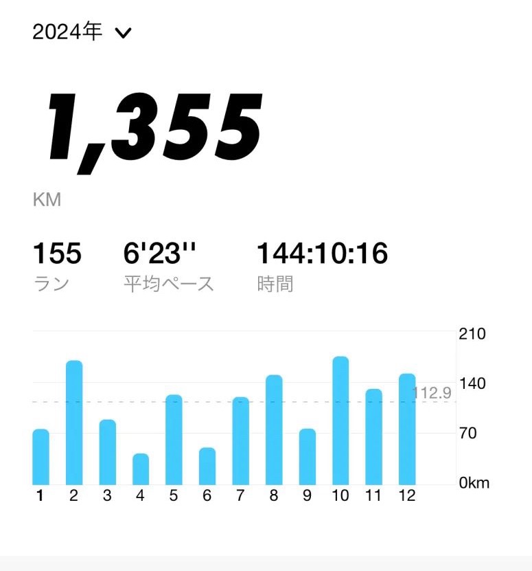 2024年のランニングを振り返る。フルマラソンは3月、5月、11月と3回完走して自己ベストの3時間53分を記録したのが11月の東北・みやぎ復興マラソンだった。初マラソンからちょうど1年後の大会だった。年間の走行距離は1,355キロ、ひと月あたりだと113キロ。回数は155回で、なんと年間休日200日超。真夏はオフシーズンとして泳いだりもしていたけど、すこし怠けすぎだろう。もっと鍛えられたという気もする。月間100キロを走れるとサブ4を達成できる、という一説があるが、それはぼくの経験とも一致する。トレーニング量からしてサブ4レベルの1年だったということ。サブ4が当座の目標だったから、一応は狙い通りの結果ともいえる。