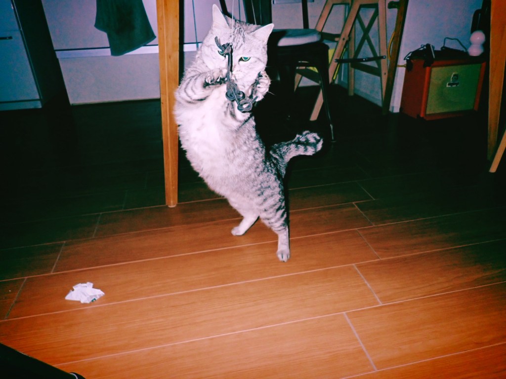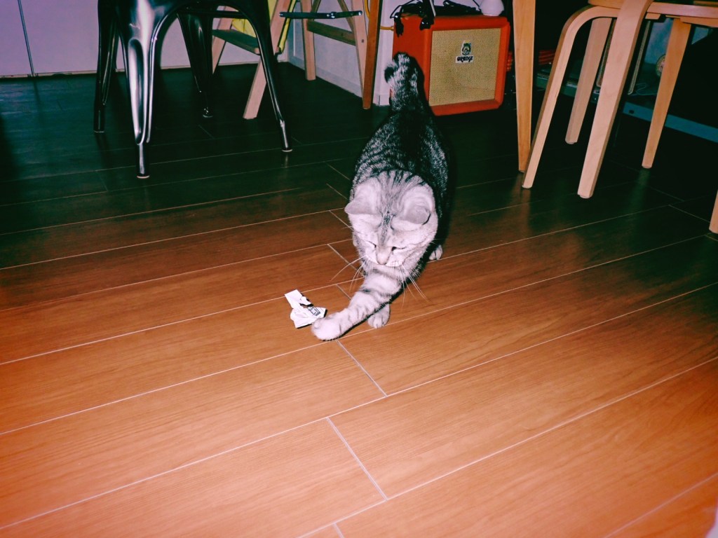 ここのところ、猫は飼い主が丸めて床に投げ捨てたメモ用紙で遊んでいる。本当は、散らばった紙くずを拾い集めてゴミ箱に捨てたいのだが、仕方がないので、いくつかは床に残したままにしている。
