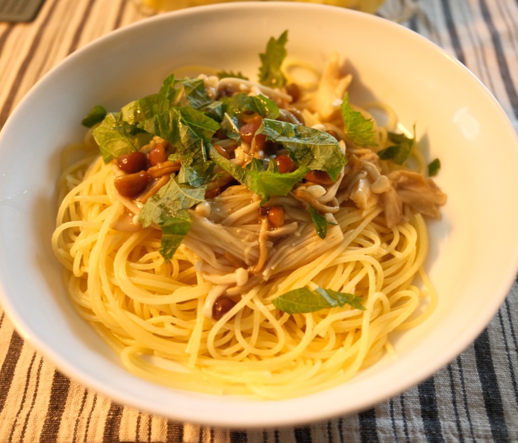 昼は、まいたけ・しめじ・なめこのマリネをパスタと絡め、大葉を散らした。ジャガイモをオーブンで焼いてばくばく食った。美味い。