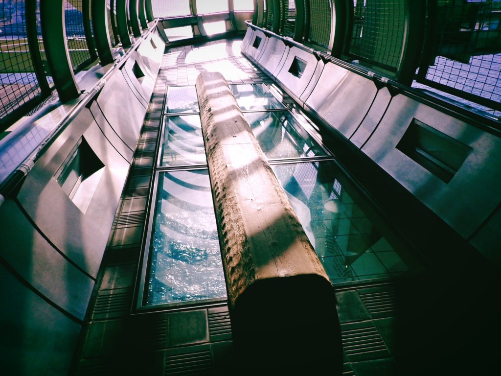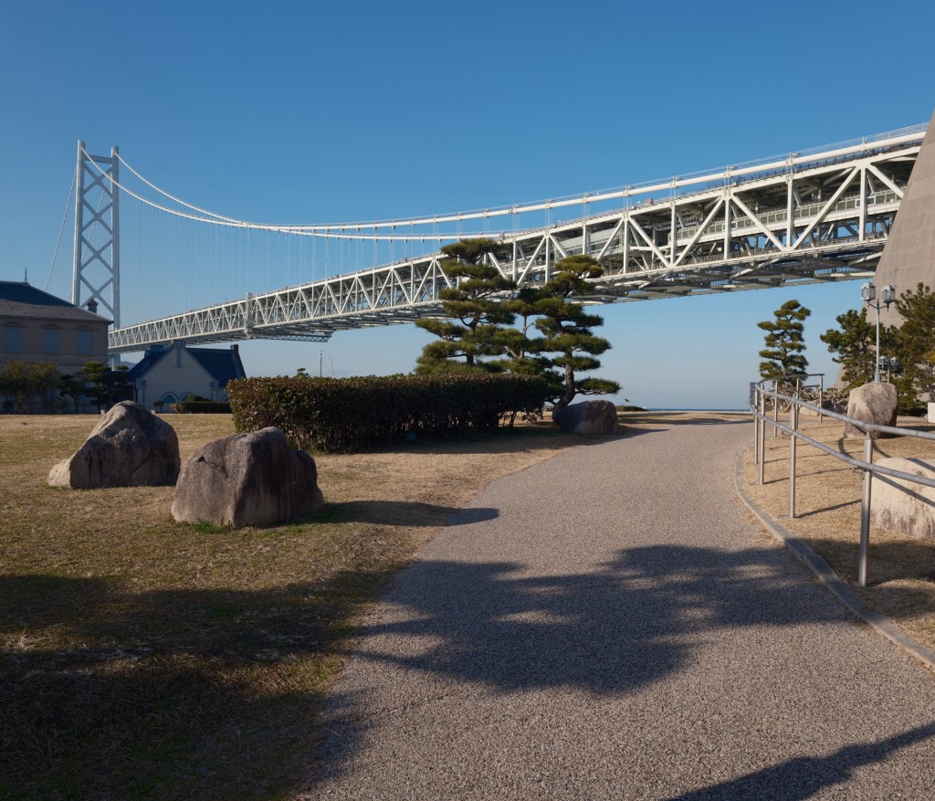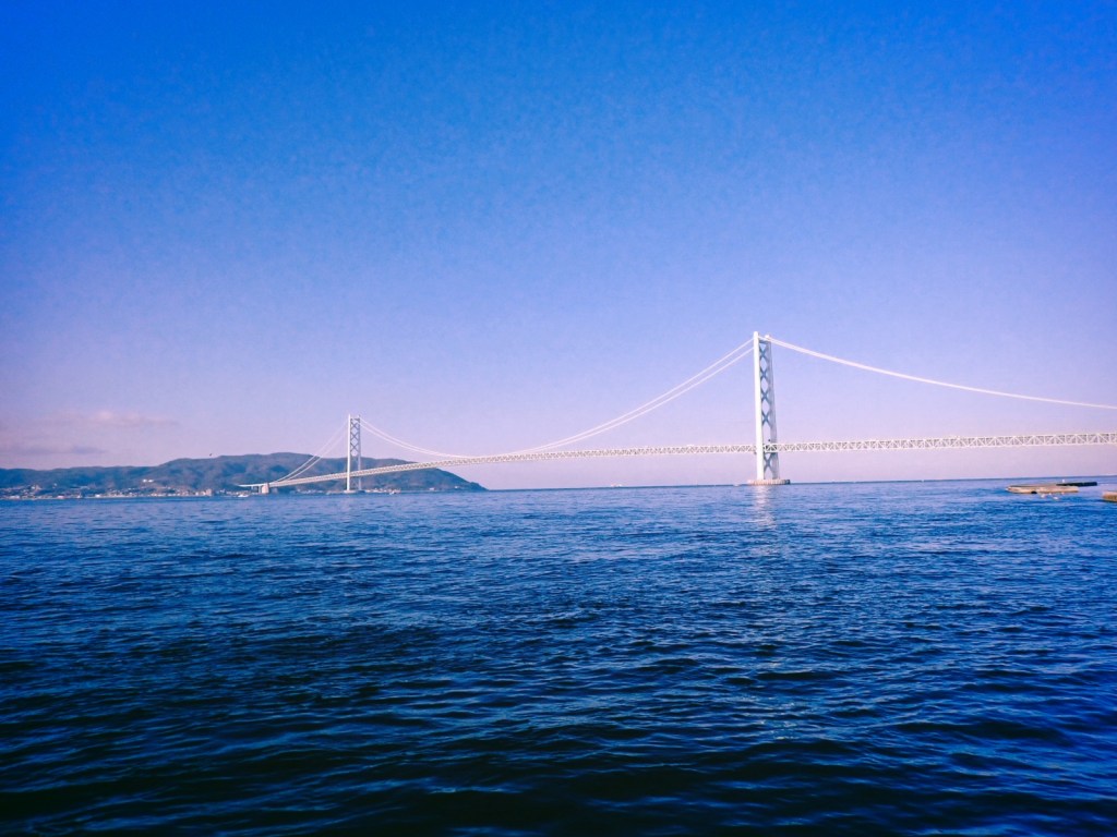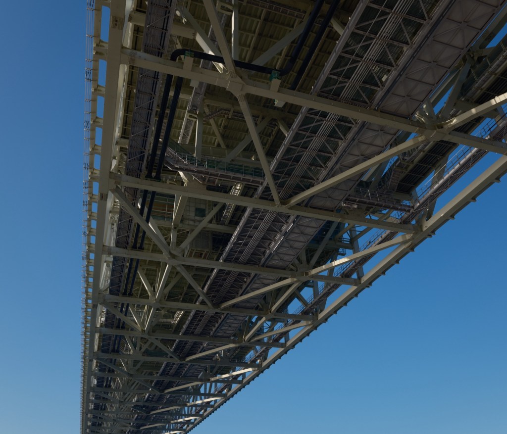 1998年の竣工。橋長は3,911メートル。中央支間1,991メートルは、2022年にトルコのチャナッカレ1915橋(中央支間2,023メートル)が完成するまでは世界一の長さの吊り橋だった。レイボーブリッジの橋長が約800メートル、ベイブリッジが約860メートルだから、スケールがまったく別もの。圧倒される。