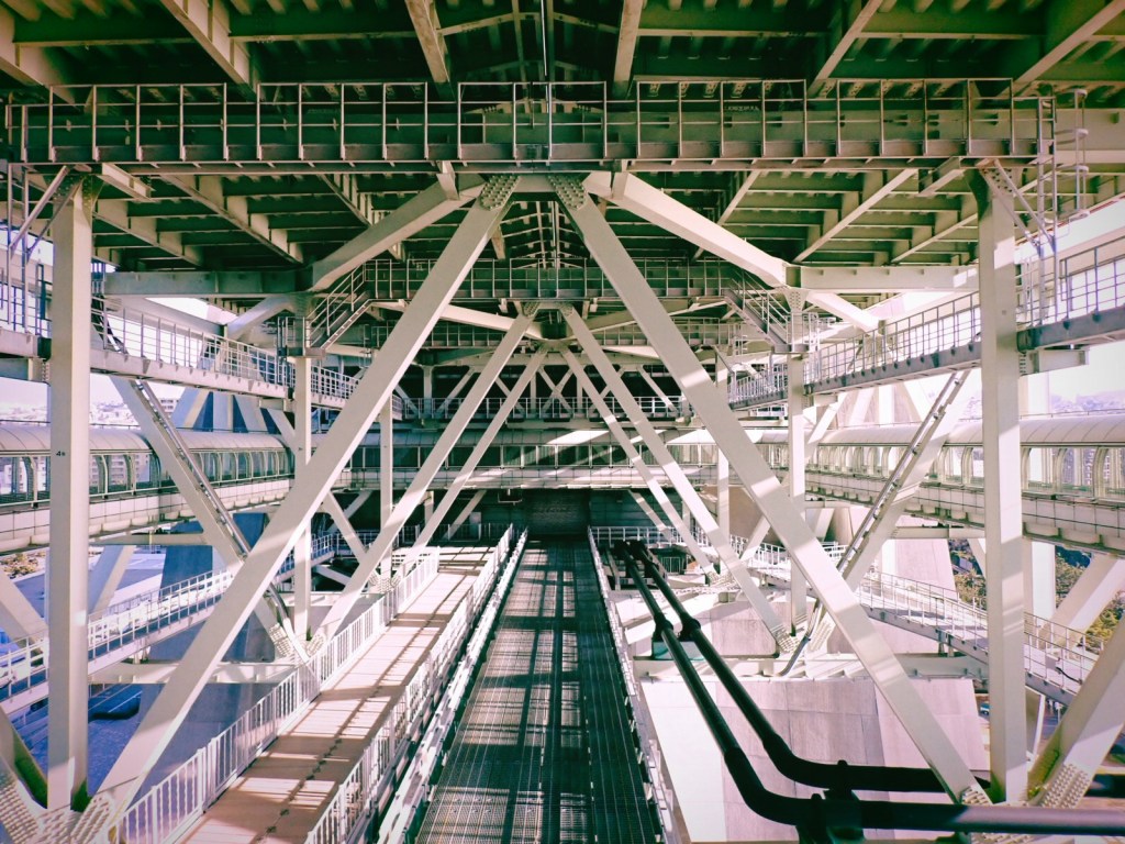 いよいよ明石海峡大橋の全容が見渡せるところまで近づく。車窓から見たことも、橋を通過したこともあったけど、地上から観察するのは今回が初めて。