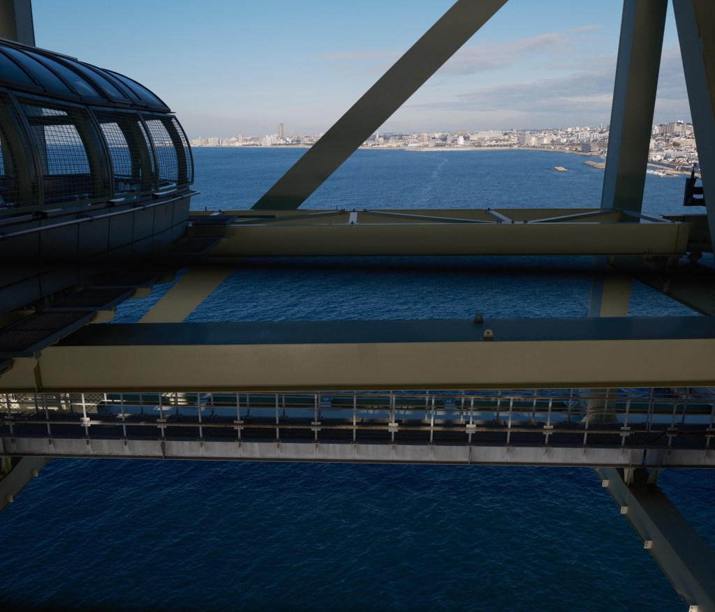 橋の上の展望デッキに上る。揺れるし風が吹きつけるから怖い。