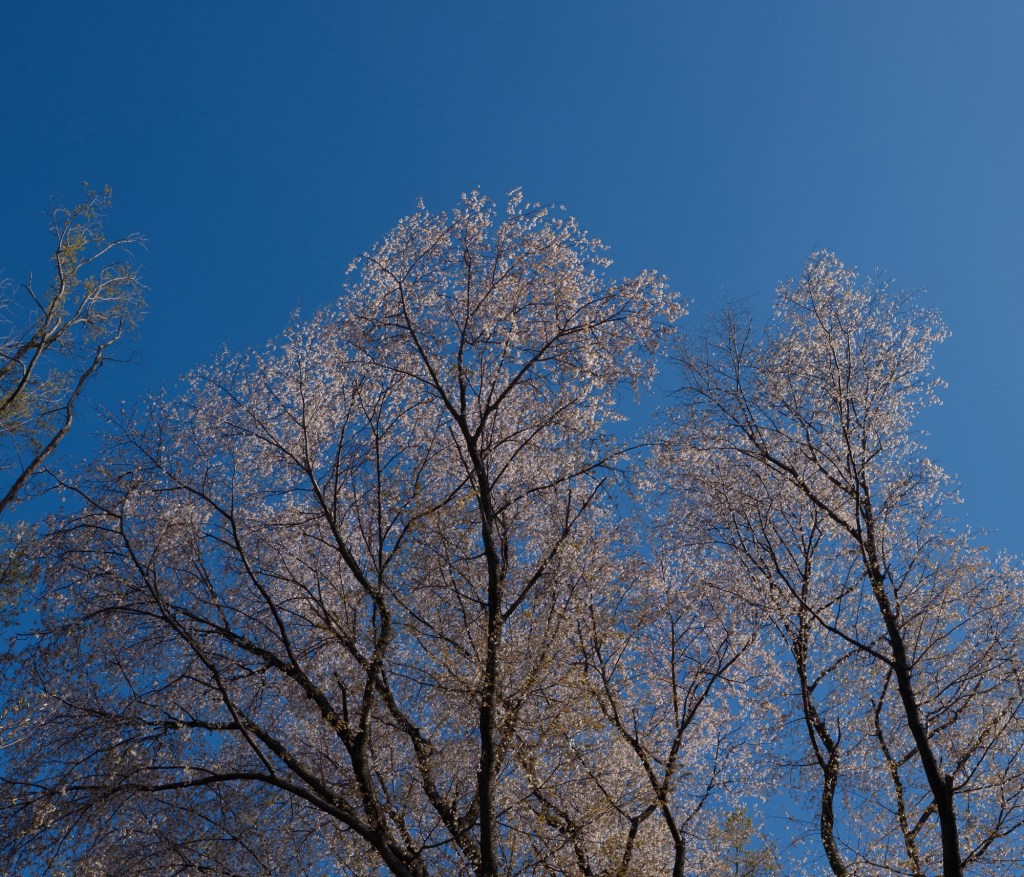 山桜を前にして、ぱっと頭に浮かんだのは谷川俊太郎の「空の青さをみつめていると」だった。陽は絶えず豪華に捨てている──、の名詩。山桜は花弁を豪華に捨てている、という感じ。今年はよい桜を見た。と書きつつ、北に足を伸ばしてなにか撮影行を計画できないかしら、と欲が張ってきている。やはり山に自生する桜は好きだ。